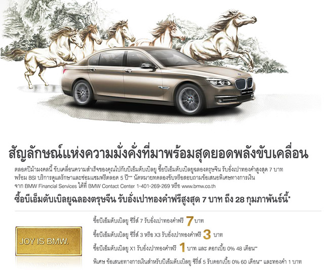 BMW ต้อนรับปีใหม่จีน หรือ Chinese New year 2014 สำหรับผู้ที่ซื้อรถยนต์บีเอ็มดับเบิลยู รับทองคำสูงสุด 7 บาท* พร้อมบำรุงรักษาฟรี 5 ปี หรือ 100,000 กม. (แล้วแต่อย่างใดอย่างหนึ่งถึงก่อน)