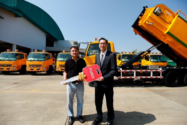 มร.สตีเฟ่น หยง (ขวา) ประธาน บริษัท ฟูโซ่ ทรัค (ประเทศไทย) จำกัด เดินทางไปส่งมอบรถบรรทุกฟูโซ่ รุ่น Fighter FN2524 ซึ่งเป็นรถบรรทุก 10 ล้อ จำนวน 30 คันให้แก่ คุณไกรวรรณ์ นรารุจนีธนันต์ กรรมการผู้จัดการ บริษัท บีทีดี เอ็นไวรอนเมนทอล โซลูชั่นส์ จำกัด ที่ให้ความไว้วางใจในคุณภาพมาตรฐานของรถบรรทุกฟูโซ่