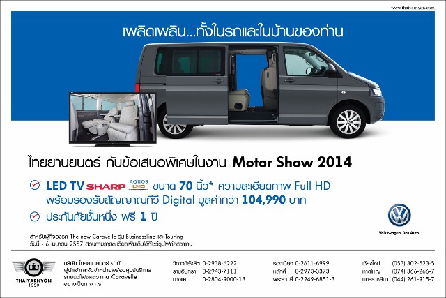- รถยนต์ Volkswagen รุ่น The New Caravelle Business ราคา 3,450,000 บาท ผ่อนสบายๆ แค่เดือนละ 29,000 บาท ระยะเวลานาน 60 เดือน พร้อมติดตั้งความสุขให้แก่ครอบครัว ด้วย LED TV ยี่ห้อ Sharp ขนาด 70 นิ้ว ความละเอียดภาพ Full HD พร้อมรองรับสัญญาณ TV Digital มูลค่า 104,990 บาท และประกันภัยชั้น 1 นาน 1 ปี