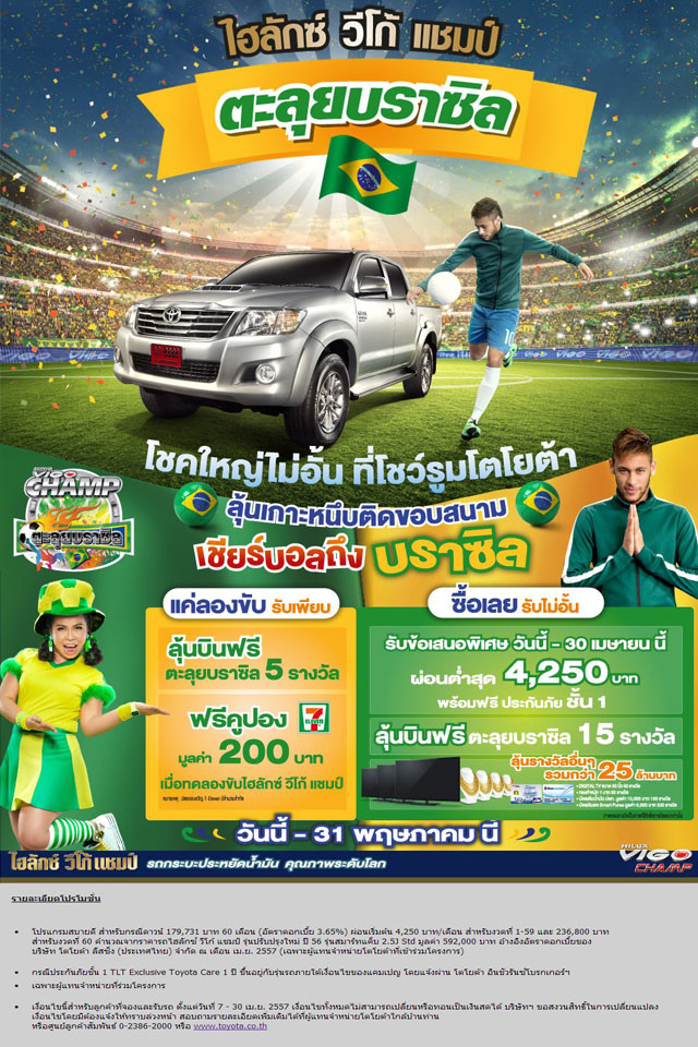 กติกาและเงื่อนไข - ผู้ที่ทดลองขับไฮลักซ์ วีโก้ แชมป์ รุ่นใดก็ได้ ที่โชว์รูมโตโยต้าทุกสาขา ตั้งแต่ 24 มี.ค. - 31 พ.ค. 2557 จะได้รับบัตรของขวัญ 7-Eleven มูลค่า 200 บาท (จำนวนจำกัด) และคูปองเพื่อกรอกรายละเอียดเพื่อส่งชิงโชคที่ตัวแทนจำหน่ายโตโยต้าทุกสาขา ภายในวันที่ 31 พ.ค. 2557 เท่านั้น ของรางวัล รางวัลที่ 1 แพคเกจทัวร์ประเทศบราซิล จำนวน 5 รางวัล มูลค่ารางวัลละ 850,000 บาท (รางวัลละ 1 ที่นั่ง)