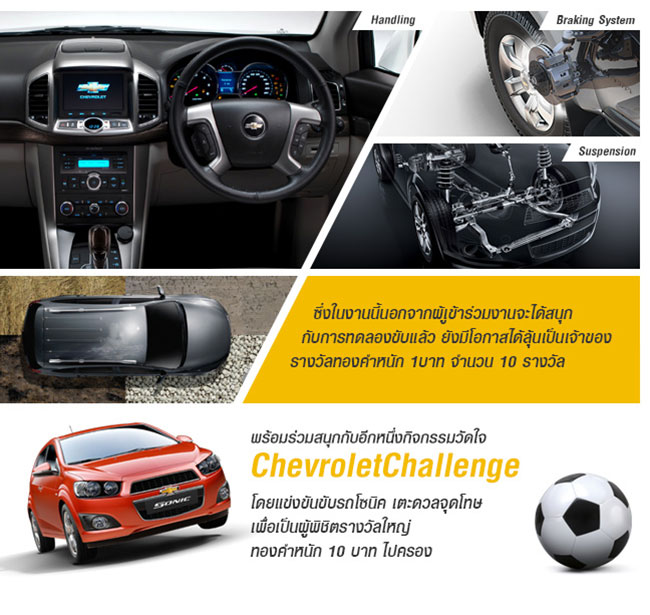 ในงานนี้นอกจากผู้เข้าร่วมงานจะได้สนุกกับการทดลองขับแล้ว ยังมีโอกาสได้ลุ้นเป็นเจ้าของรางวัลทองคำหนัก 1 บาทจำนวน 10 รางวัล พร้อมร่วมสนุกกับอีกหนึ่งกิจกรรมวัดใจ Chevrolet Challenge โดยแข่งขันขับรถโซนิคเตะ ดวลจุดโทษ เพื่อเป็นผู้พิชิตรางวัลใหญ่ ทองคำหนัก 10 บาทไปครอง
