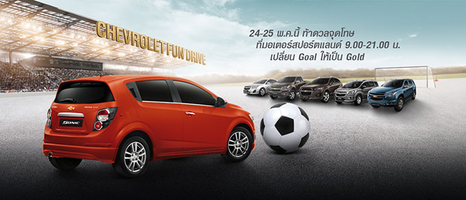 เปิดประสบการณ์ทดลองขับแบบใหม่สุดเร้าใจกับเชฟโรเลต พร้อมลุ้นรับทองคำ มูลค่ารวม 440,000 บาท* 24-25 พ.ค. นี้ สัมผัสความสนุกสุดเร้าใจ กับกิจกรรม Chevrolet Fun Drive การทดลองขับที่จะทำให้คุณได้รู้จักกับสมรรถนะที่แท้จริงของรถยนต์เชฟโรเลตทุกรุ่น ตลอดทั้งวัน พร้อมลุ้นเป็นผู้โชคดี รับทองคำมูลค่ารวม 440,000 บาทไปครอง