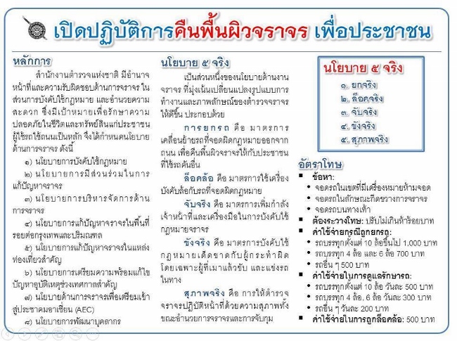 ทั้งนี้ สำนักงานตำรวจแห่งชาติ จะรณรงค์และส่งเจ้าหน้าที่สุ่มตรวจอย่างต่อเนื่อง และเตรียมลงพื้นที่ตรวจในเวลากลางคืนตามสถานบริการต่างๆ ที่ปล่อยให้มีการจอดในพื้นที่ห้ามจอด โดยตำรวจนครบาลจะประชุมหารือร่วมกับกรุงเทพมหานคร เพื่อแก้ไขปัญหารถจักรยานยนต์ ที่นำขึ้นไปจอดบนทางเท้า ตลอดจนร้านค้าหาบเร่แผงลอยต่าง ๆ ที่วางขายในพื้นที่หวงห้าม ส่งผลกระทบต่อการจราจร จากนั้นจะเชิญกรมการขนส่งทางบก ประชุมเพื่อแก้ไขปัญหารถตู้ต่อไป โดยนโยบายนี้มีผลบังคับใช้ตั้งแต่วันที่ 9 มิ.ย.2557 ที่ผ่านมา