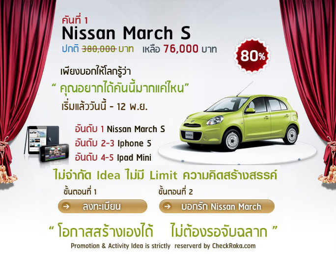 ด้วยโจทย์ง่ายๆ ที่ให้ผู้เข้าแข่งขันบอกเข้ามาว่า "คุณอยากได้รถคันนี้แค่ไหน" โดยใครบอกได้ "โดนและสร้างสรรค์" ที่สุด ก็จะมีสิทธิซื้อรถยนต์นิสสัน มาร์ชไปในราคาเพียง 76,000 บาท จากราคาปกติ 380,000 บาท