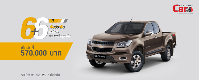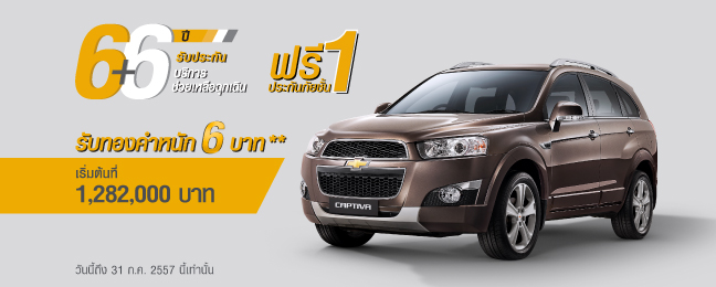 เชฟโรเลต ต่อเวลาที่สุดแห่งข้อเสนอ พร้อมเพิ่มความคุ้มค่ามากยิ่งขึ้น กับโปรแกรมขยายการรับประกันนานสูงสุด ถึง 6 ปี พร้อมบริการช่วยเหลือฉุกเฉินตลอด 6 ปี พิเศษรับเพิ่มทันที ทองคำหนักสูงสุด 6 บาท สำหรับลูกค้าที่จองภายใน 31 ก.ค. 2557 นี้เท่านั้น