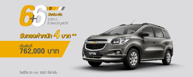 - รถยนต์เชฟโรเลต สปิน ทุกรุ่น ฟรีโปรแกรมขยายการรับประกัน 6 ปี และทองคำหนัก 4 บาท
