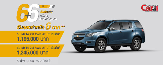 - *เฉพาะลูกค้าใหม่ที่จองรถยนต์เชฟโรเลต เทรลเบลเซอร์ MY14 2.8 2WD AT LT และ MY14 2.8 4WD AT LT ฟรีโปรแกรมขยายการรับประกัน 6 ปี และทองคำหนัก 6 บาท
