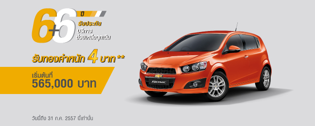 - รถยนต์เชฟโรเลต โซนิค MY14 ฟรีโปรแกรมขยายการรับประกัน 6 ปี และทองคำหนัก 6 บาท พร้อมฟรีประกันภัยชั้นหนึ่ง 1 ปี ที่ทำสัญญาซื้อขายแล้วเสร็จ ระหว่างวันนี้ ถึง 31 กรกฎาคมนี้ เท่านั้น