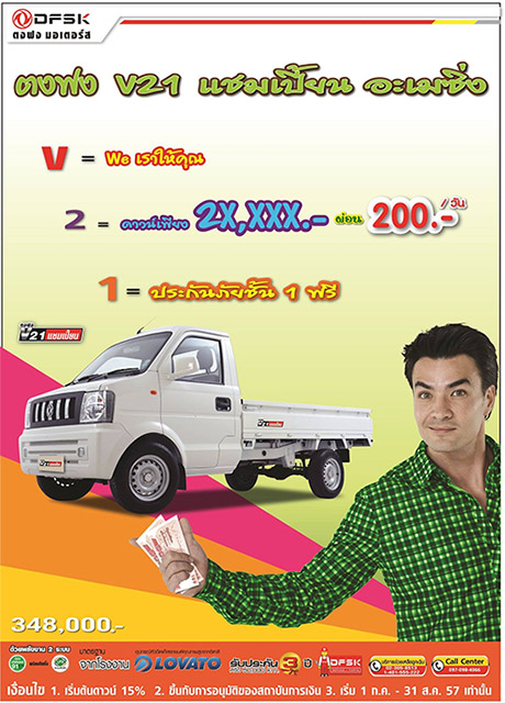 ตงฟง มอเตอร์ส แบรนด์รถจีนเพื่อการพาณิชย์อันดับหนึ่งของประเทศ จัดโปรโมชั่นใหญ่ถึง 2 แคมเปญ ตรวจเช็คสภาพฟรี 27 รายการ พร้อมรับส่วนลดค่าอะไหล่อีก 15% และ ดาวน์ ตงฟง V21 แชมเปี้ยน เพียง 20,000 บาท นายพิทยา ธนาดํารงศักดิ์ กรรมการผู้จัดการ บริษัท ตงฟง มอเตอร์ส (ประเทศไทย) จำกัด ผู้ผลิตและจัดจำหน่ายรถยนต์เชิงพาณิชย์ขนาดเล็กภายใต้แบรนด์ตงฟง ได้เปิดเผยว่า "เพื่อเป็นการขอบคุณทั้งลูกค้าเก่าและลูกค้าใหม่ของ ตงฟง มอเตอร์ส จึงได้จัดแคมเปญสุดพิเศษออกมาพร้อมกันถึง 2 แคมเปญ ประกอบด้วย แคมเปญ "ฝนนี้...เช็คฟรีที่ตงฟง" ลูกค้าตงฟงสามารถนำรถเข้ามาตรวจเช็คระยะได้ฟรี 27 รายการ ที่ศูนย์บริการตงฟงทั่วประเทศ พร้อมรับส่วนลดค่าอะไหล่อีก 15% นอกจากนี้ยังรับฟรีร่มตงฟง ลุยฝน สุดเท่ห์มูลค่า 550 บาท ตั้งแต่วันที่ 10 กรกฎาคม - 10 สิงหาคม ศกนี้ สำหรับแคมเปญนี้จัดขึ้นเพื่อขอบคุณลูกค้าเก่าที่อยู่ด้วยกันมานาน ในส่วนของลูกค้าใหม่ที่กำลังจะเข้ามาเป็นส่วนหนึ่งของตงฟง เราได้จัดอีกแคมเปญสุดพิเศษ คือ "ตงฟง V21 แชมเปี้ยน อะเมซิ่ง" โดยลูกค้าที่ซื้อ รถตงฟง V21 แชมเปี้ยน ดาวน์เพียง 20,000 บาท พร้อมฟรีประกันภัยชั้นหนึ่ง แถมผ่อนสบายๆ แค่วันละ 200 บาท ตั้งแต่วันที่ 1 กรกฎาคม - 31 สิงหาคม นี้"