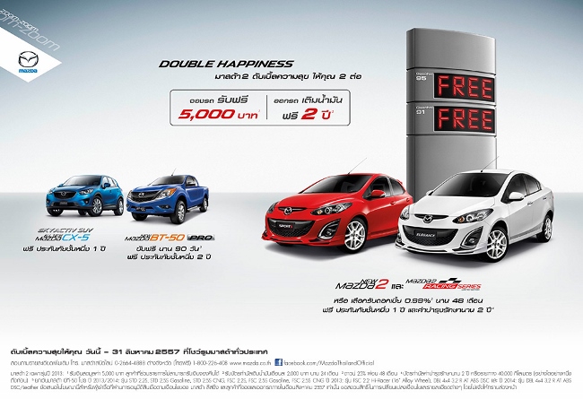 Mazda - มาสด้า 2 จัดโปรโมชั่นร้อนแรง ดับเบิ้ลความสุขให้คุณ 2 ต่อ จองรถ รับฟรี 5,000 บาท* และออกรถ เติมน้ำมันฟรี 2 ปี** หรือดอกเบี๊ย 0.99% ฟรีประกันชั้น 1 ก่อน 31 ส.ค. 57