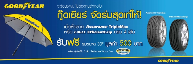 Goodyear - กู๊ดเยียร์จัดโปรโมชั่นพิเศษให้คุณเก๋กู๊ดรับหน้าฝน เมื่อซื้อยาง "แอชชัวแรนซ์ ทริปเปิ้ลแมกซ์" หรือ "อีเกิล เอฟฟิเชี่ยนกริป" ครบ 4 เส้น รับฟรี "ร่มกู๊ดเยียร์สีเหลืองสุดชิค" มูลค่า 500 บาท