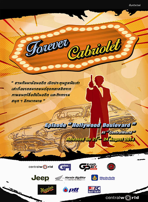 ขอเชิญผู้สนใจสามารถเข้าชมงาน "Forever Cabriolet at CentralWorld Episode: Hollywood Blvd." พบกับรถยนต์คลาสสิคและรถในภาพยนตร์ฮอลลีวูดมากกว่า 50 คัน เปิดแสดงให้สัมผัสอย่างใกล้ชิด ระหว่างวันที่ 21-24 สิงหาคม 2557 ณ ลานเซ็นทรัลคอร์ท ศูนย์การค้าเซ็นทรัลเวิลด์