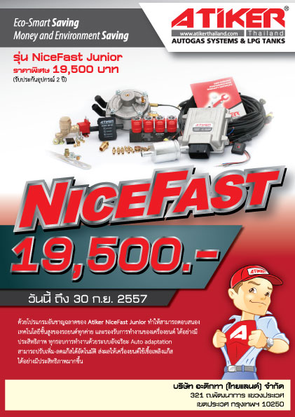 เพื่อเป็นการใช้ทรัพยากรอย่างคุ้มค่าและรักษาสิ่งแวดล้อม ทางบริษัท อะติกทา (ไทยแลนด์) จำกัด มีความยินดีที่จะร่วมสนับสนุนการใช้แก๊สในรถยนต์โดยทุกท่านสามารถติดแก๊สรถยนต์ของอะติกเกอร์ (Atiker) รุ่น NiceFast Junior ในราคา 19,500 บาท ได้ตามที่สถานบริการติดตั้งแก๊สรถยนต์ทั่วประเทศจนถึงวันที่ 30 กันยายน 2557