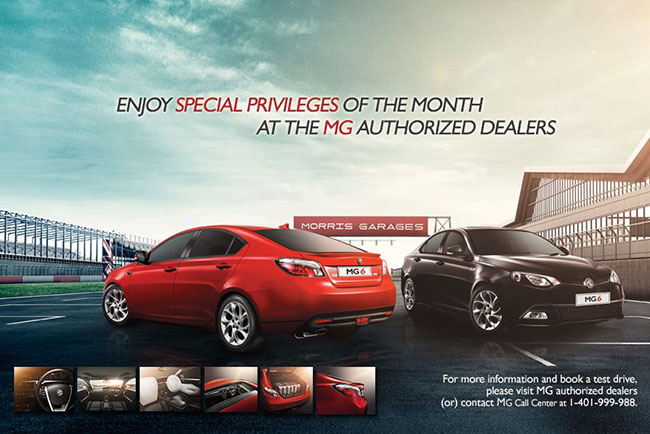 - ข้อเสนอพิเศษนี้สาหรับท่านเจ้าของหรือผู้ครอบครองรถยนต์เอ็มจีรุ่น เอ็มจี6 ที่ทำการซื้อรถยนต์เอ็มจี6 กับผู้จำหน่ายที่ได้รับการแต่งตั้งอย่างเป็นทางการจากบริษัทเอ็มจี เซลส์ (ประเทศไทย) จำกัด โดยจะต้องทำการจองระหว่างวันที่ 1 - 30 กันยายน 2557 พร้อมทำสัญญาซื้อขายและรับรถ แล้วเสร็จภายในวันที่ 30 กันยายน 2557 เท่านั้น