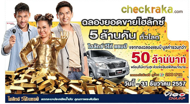 "ไฮลักซ์ วีโก้ แชมป์ ฉลองยอดขายไฮลักซ์ 5 ล้านคันทั่วโลก คืนความสุข แจกทอง 50 ล้านบาท" เพื่อเป็นการขอบคุณลูกค้าผู้มีอุปการคุณ และร่วมเฉลิมฉลองความสำเร็จในโอกาสที่รถกระบะ ไฮลักซ์ มียอดจำหน่ายสะสมทั่วโลก ครบ 5 ล้านคัน