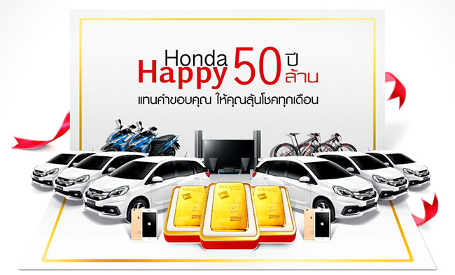 เนื่องในโอกาสที่ฮอนด้าได้ดำเนินธุรกิจในประเทศไทยครบ 50 ปี ในปี 2557 กลุ่มบริษัทฮอนด้าขอขอบคุณลูกค้าชาวไทยที่ให้ความเชื่อมั่นและสนับสนุนฮอนด้ามาโดยตลอด พร้อมมุ่งมั่นพัฒนาผลิตภัณฑ์ เพื่อส่งมอบความสุขให้กับลูกค้าชาวไทย และตอบแทนความเชื่อมั่นจากสังคมไทย ด้วยการสานต่อพันธสัญญาที่จะร่วมเติบโตเคียงข้างสังคมไทยตลอดไป