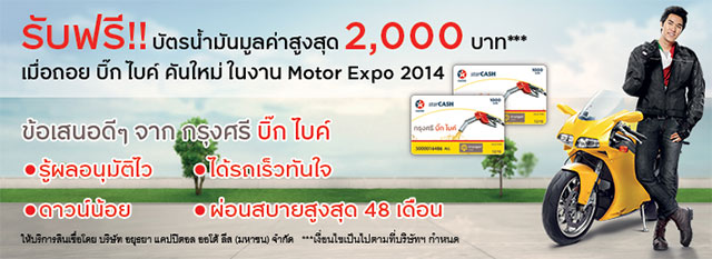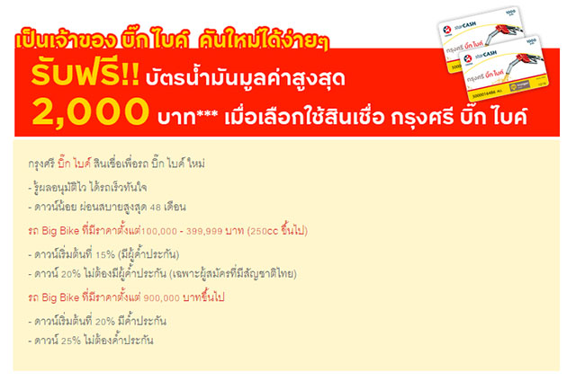- รับฟรี!! บัตรน้ำมันสูงสุด 2,000 บาท*** เมื่อสมัครสินเชื่อ กรุงศรี บิ๊ก ไบค์