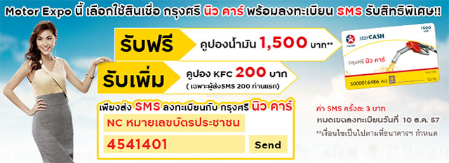 - รับฟรี!! บัตรน้ำมัน 1,500 บาท** และรับเพิ่มบัตรกำนัล KFC 200 บาท เมื่อสมัครสินเชื่อพร้อมลงทะเบียนผ่าน SMS ในงาน Motor Expo 2014