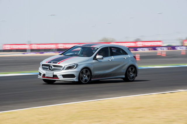 เมื่อเสร็จสิ้นก็เป็นช่วงพักรับประทานอาหารกลางวัน แล้วต่อด้วยไฮไลท์การขับแบบเต็มรอบสนามจริงในช่วงบ่าย โดยแบ่งรถออกเป็นกลุ่ม(5 คัน) และมีครูฝึกขับนำ วิธีการขับคือ หัวแถวไปไลน์ไหนให้ตามไปไลน์นั้น และควรรักษาระยะห่างประมาณ 2 ช่วงคันรถ โดยออกไปเที่ยวละ 2 รอบสนามแล้วจึงกลับเข้าพิตเพื่อสลับคนขับหรือสลับรถ โดยมีเวลาให้มากพอได้ครับครบทุกรุ่น สำหรับทีมงานแฟนเพจ คาร์กูรู ไทยแลนด์ และเว็บไซต์เช็คราคา.คอม ได้ขับครบทุกรุ่นหลัก และเกือบครบทุกรุ่นย่อย สรุปได้ว่ารุ่นที่ให้ความประทับใจในการขับบนสนามแข่งมากสุดคือ C300 Bluetec hybrid estate ด้วยพลังและความสมดุลที่ลงตัวทำให้การเข้า-ออกโค้งทำได้ดีกว่ารุ่นอื่นๆ และสามารถแสดงพลังได้อย่างเต็มที่ในสนามแห่งนี้ รุ่นที่ชอบรองลงมาเป็น A45 AMG พลัง 360 แรงม้า ให้อัตราเร่งแบบหลังจมเบาะ ด้วยกำลังอันมหาศาลจึงไล่ตามติดได้ทุกโค้งแบบสบายๆ น่าเสียดายที่ตำแหน่งการเรียงรุ่นรถ A45 ถูกวางไว้หลังรถรุ่นใหญ่อย่าง E-Class ในกลุ่ม ทำให้การระเบิดพลังทำได้จำกัด และสุดท้ายที่ชอบก็คือ SLK200 โรดสเตอร์เปิดประทุน อันมีรูปลักษณ์โดดเด่นที่สุดในสนาม นับเป็นรถที่ขับสนุก เข้า-ออกโค้งได้ฉับไว ท้ายมีอาการโอเวอร์สเตียร์ให้ได้สัมผัสบ้างในช่วงเข้าโค้งแคบ แต่ก็ช่วยให้การเข้าโค้งง่ายขึ้น
