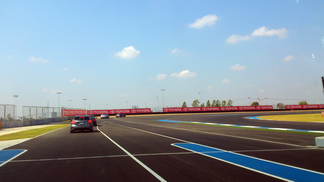 จากนั้นต่อด้วยการฝึกเข้าโค้งตามไลน์การขับแข่งจริง โดยการวางไพลอนมีดังนี้ 3 ไพลอนตั้งเรียงติดบอกถึงจุดเบรกหรือชะลอความเร็ว ส่วน 2 ไพลอนเรียงติดบอกถึงจุดเลี้ยว และไพลอนตัวเดียวบอกถึงจุด Apex ที่ควรเข้าให้ชิดสุด การขับตามไลน์รถผู้ฝีกสอนในช่วงเดโม่รัน ทำให้สามารถควบคุมจังหวะและจุดเบรกได้ง่าย เมื่อทดลองขับจริงก็พบว่าต้องเน้นการใช้ความเร็วเข้า-ออกโค้งให้เหมาะสม รวมถึงมีสมาธิกับจุดเบรกและเลี้ยวอยู่ตลอด