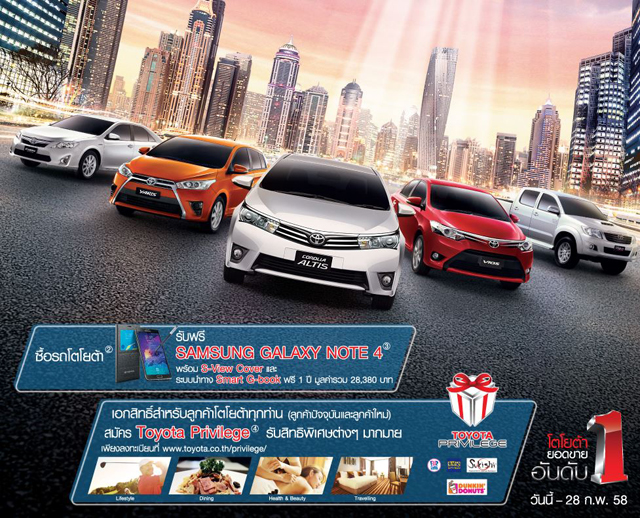 โปรโมชั่นจากโตโยต้าเดือนกุมภาพันธ์ 58 พิเศษซื้อวันนี้รับ Sumsung Galaxy Note 4 และอีกหลากหลายรุ่น เริ่มต้นดอกเบี้ย 0% นาน 4 ปี, ประกันภัยชั้นหนึ่ง ก่อน 28 ก.พ. 58โตโยต้าขอบคุณทุกความไว้ใจ กับยอดขายอันดับ 1 ด้วยข้อเสนอสุดพิเศษ