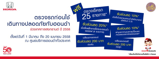 ตั้งแต่วันที่ 1 มีนาคม ถึง 20 เมษายน 2558 ฮอนด้า ชวนตรวจรถก่อนใช้ เพื่อความปลอดภัยช่วงสงกรานต์ โดยเปิดรับบริการตรวจเช็คฟรี 25 รายการ พร้อมรับส่วนลด 20 เปอร์เซ็นต์ เมื่อซื้อแพคเกจเช็คระยะฮอนด้าเพย์เซฟ (4 ระยะทาง), เปลี่ยนยางรถยนต์หรือแบตเตอรี่ รับส่วนลด 200 บาทต่อเส้นหรือลูก และรับส่วนลด 10 เปอร์เซ็นต์ เมื่อซื้อโปรแกรมฮอนด้าอัลติเมทแคร์ (อัลติเมท2,3) หรือผ้าเบรก/จานเบรก/แม่ปั๊มเบรก/หม้อลมเบรก/สายอ่อนเบรก*ผู้ใช้รถฮอนด้าสามารถเข้ารับบริการได้ที่ ศูนย์บริการฮอนด้าทั่วประเทศ