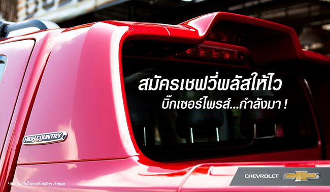 Chevy Plus Big Surprise สมาชิกเชฟวี่พลัส ร่วมลุ้นเป็นเจ้าของโคโลราโด ไฮคันทรี ง่ายๆ เพียงอัพโหลดคลิปวิดิโอความประทับใจที่มีต่อ เชฟโรเลตท ความยาวไม่เกิน 30 วินาที บน Facebook ของคุณ แล้วส่ง ชื่อ นามสกุล อาชีพ เบอร์โทร และชื่อ Facebook ของคุณมาที่ marketing.activity@gm.com หรือดูรายละเอียดเพิ่มเติมที่ Facebook Chevrolet ThailandChevy Plus Program คือ บริการและสิทธิพิเศษต่างๆ ที่ทางเชฟโรเลต สรรหามาตรงกับไลฟ์สไตล์ในทุกๆ การใช้ชีวิต เพื่อมอบให้กับลูกค้าคนสำคัญ ไม่ว่าเส้นทางของคุณ จะเป็นการไปพักผ่อน ช้อปปิ้ง กินข้าว ดูหนัง ฟังเพลง เติมน้ำมัน ฯลฯสำหรับผู้ที่สนใจ สามารถลงทะเบียนรับสิทธิ์ Chevy Plus ได้ที่ลิงก์ด้านล่างนี้ตรวจสอบรายละเอียดและกติกาเพิ่มเติมได้ที่ www.chevrolet.co.th หรือ Facebook Chevrolet Thailandสอบถามเพิ่มเติม โทร. 1734 หรือทางเว็บไซต์ www.chevrolet.co.thข่าว-โปรโมชั่นล่าสุดอื่นๆ