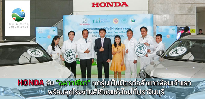 บริษัท ฮอนด้า ออโตโมบิล (ประเทศไทย) จำกัด รับเครื่องหมาย "ฉลากเขียว" ทุกรุ่นที่ผลิตในประเทศไทย จากสำนักงานมาตรฐานผลิตภัณฑ์อุตสาหกรรม กระทรวงอุตสาหกรรม และสถาบันสิ่งแวดล้อมไทย พร้อมเปิดโรงงานสีเขียวเผยกระบวนการผลิตรถยนต์และการจัดการพลังงานให้เกิดประสิทธิภาพสูงสุด ตอกย้ำพันธสัญญาด้านสิ่งแวดล้อม ภายใต้สโลแกน "Blue Skies for Our Children"