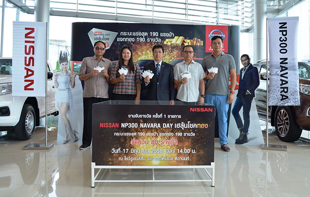 นายประพัฒน์ เชยชม รองกรรมการผู้จัดการใหญ่อาวุโสการตลาดและขาย บริษัท นิสสัน มอเตอร์ (ประเทศไทย) จำกัด เปิดเผยว่า กิจกรรมส่งเสริมการขาย เพื่อตอบแทนลูกค้าที่ซื้อรถกระบะนิสสัน เอ็นพี 300 นาวารา "Nissan NP300 Navara Day เฮลุ้นโชคทอง กระบะแรงสุด 190 แรงม้า แจกทอง 190 รางวัล" ที่บริษัทจัดขึ้นระหว่างวันที่ 15 พฤษภาคม - 30 มิถุนายน 2558 ซึ่งบริษัทได้มีการจับรางวัลเพื่อมอบโชคให้ลูกค้า ครั้งที่ 1 จำนวน 80 รางวัล แล้ว