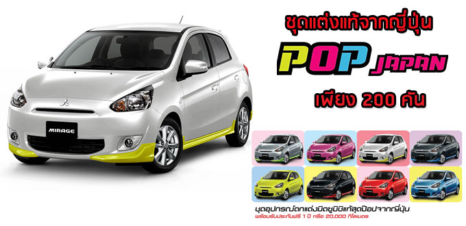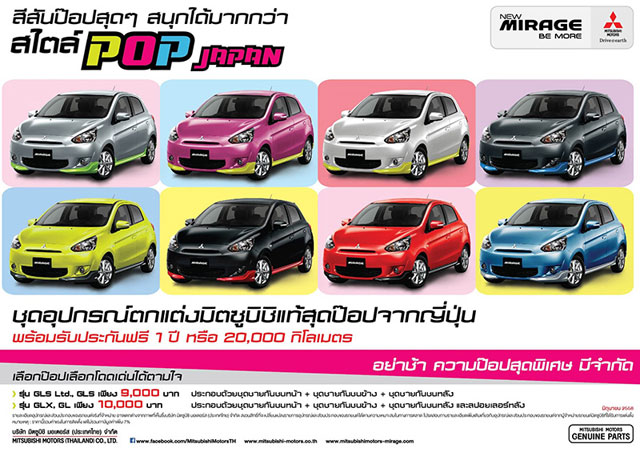 มิตซูบิชิ เอาใจวัยรุ่น เติมสีสันไม่เหมือนใครให้กับมิราจคันเก่งด้วยชุดแต่งแท้รอบคันจากประเทศญี่ปุ่น "มิราจ ป๊อป เจแปน (Mirage Pop Japan)" จำนวนจำกัดพร้อมขายที่โชว์รูมรถยนต์มิตซูบิชิทั่วประเทศตั้งแต่วันนี้เป็นต้นไป