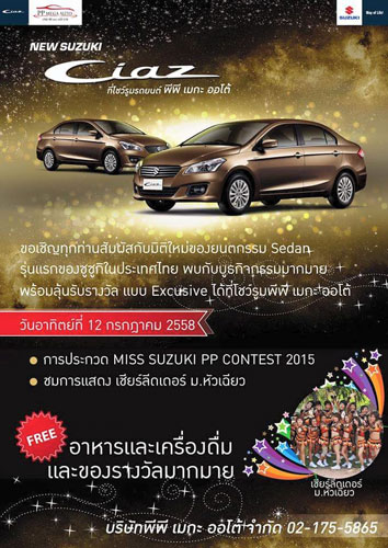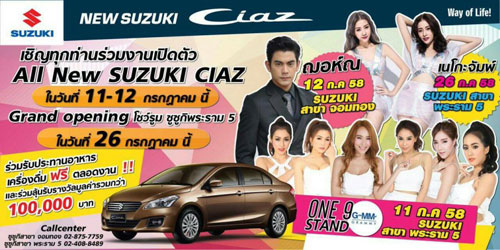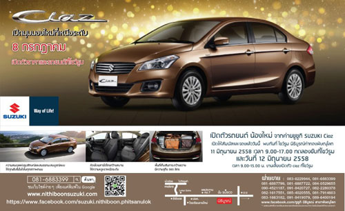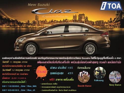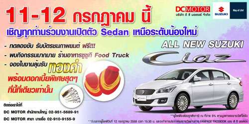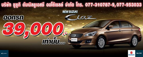 สำหรับโปรโมชั่นต่างๆ นี้ เป็นรายการส่งเสริมการขายเฉพาะโชว์รูมแต่ละแห่งเท่านั้น ไม่ใช่โปรโมชั่นหลักจากซูซูกิ มอเตอร์ ประเทศไทย และรวบรวมจากเว็บไซต์ www.thaiciaz.com สอบถามเพิ่มเติมที่ โทร. 1800-600-900 มือถือ 1401-600-900 และ