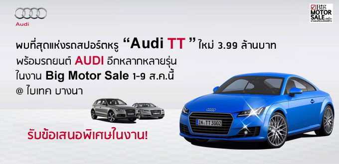 พบที่สุดแห่งความสปอร์ต รถยนต์ออดี้ ทีที 2.0 ทีเอฟเอสไอ ทั้งแรงระดับ 230 แรงม้า และประหยัด พร้อมระบบขับเคลื่อน 4 ล้อ Quattro นำเข้าทั้งคันจากประเทศเยอรมนีแท้ๆ ไม่ต้องปวดหัวเรื่องความจุกจิกกวนใจ ... เพราะผลิตเพื่อประเทศไทยโดยเฉพาะ! ในราคาสุดคุ้ม 3.99 ล้านบาท ในงาน BIG MOTOR SALE 2015 ระหว่างวันที่ 1 - 9 สิงหาคมนี้ ที่ไบเทค บางนาภายในงานฯ ออดี้ ได้นำสุดยอดยนตรกรรมหรูเข้าร่วมจัดแสดงที่บูธ ออดี้ หลากหลายรุ่นพร้อมราคาพิเศษ ดังนี้