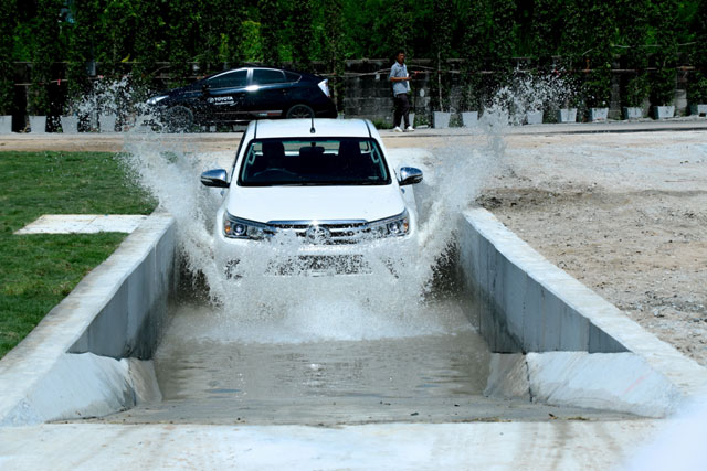 สถานีที่ 2 : Flooding พื้นที่จำลองบ่อน้ำสำหรับการทดสอบระบบป้องกันล้อหมุนฟรีแบบแอคทีฟ A-TRC (Active Traction Control) เมื่อรถต้องอยู่ในสภาวะน้ำท่วมขังสูง