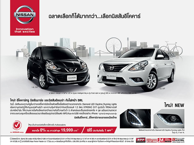 ขณะที่ด้านการส่งเสริมการจำหน่าย ได้จัดทำข้อเสนอพิเศษที่เรียกว่าคุ้มค่ามากๆ ไว้ให้ลูกค้าได้เป็นเจ้าของนิสสันอีโคคาร์ง่ายยิ่งขึ้น โดยลูกค้าสามารถเลือกข้อเสนอดอกเบี้ย 0% หรือเลือกดาวน์ต่ำเพียง 19,999 บาท พร้อมฟรีประกันภัยชั้น 1 NPP* โดยข้อเสนอพิเศษนี้สำหรับลูกค้าที่จอง และรับรถภายใน 30 กันยายน 2558