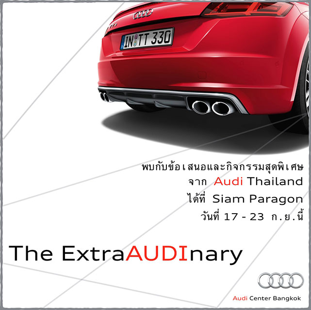 พบกับ Audi Thailand ได้ที่งาน "The ExtraAUDInary" พร้อมข้อเสนอสุดพิเศษ และกิจกรรมอื่นๆ ได้ที่ลาน Hall of Fame ชั้น M สยามพารากอน ระหว่างวันที่ 17 - 23 กันยายน 2558 นี้นะครับ