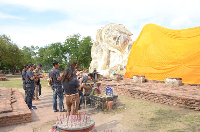 เมื่อเดินทางมาถึง "วัดโลกยสุธาราม" ได้พบกับพระพุทธไสยาสน์ ที่ใหญ่ที่สุดในเมืองอยุธยา ประดิษฐานอยู่กลางแจ้ง ตั้งอยู่ใกล้กับเขตพระราชวังโบราณและวัดพระศรีสรรเพชญ์ วัดโลกยสุธารามแห่งนี้มีผู้เดินทางมาสักการะอยู่เสมอจนกลายเป็นสัญลักษณ์ที่สำคัญของอุทยานประวัติศาสตร์พระนครศรีอยุธยา คณะสื่อมวลชนเข้าไปกราบไหว้สักการะเรียบร้อยก็เดินทางสู่ "ศาลา อยุธยา" อันเป็นที่พัก