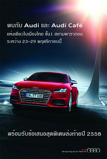 ส่งท้ายสิ้นปีไปกับ "ออดี้" ยนตรกรรมที่ผสานกันอย่างลงตัวระหว่างสมรรถนะการขับขี่ และรูปลักษณ์ที่เป็นเอกลักษณ์เฉพาะตัว พร้อมทั้งพบกับ Audi Cafe แห่งเดียวในเมืองไทย ได้ที่ชั้น 1 สยามพารากอน ระหว่างวันที่ 23-29 พฤศจิกายน 2558 นี้