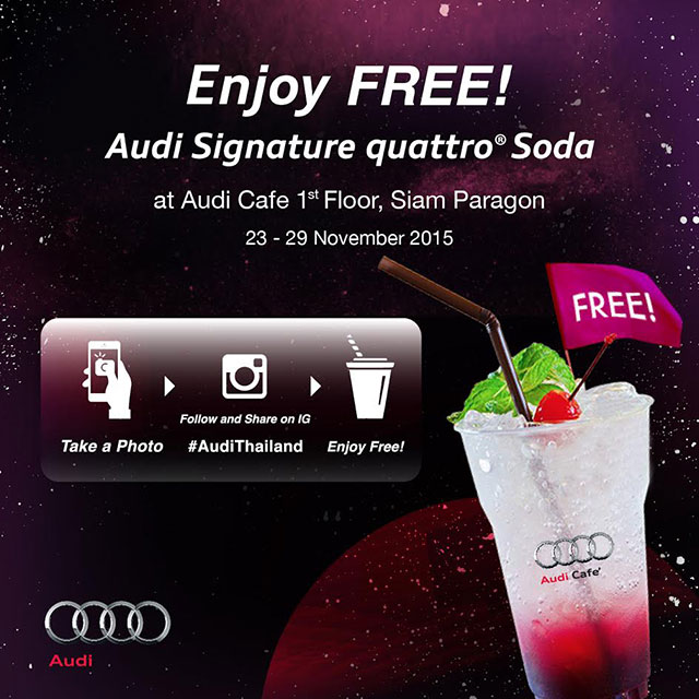 พิเศษสุดกับ Audi Cafe เพียงแค่คุณแชร์รูปของคุณกับรถยนต์ออดี้ภายในงานผ่าน Instagram พร้อมทั้งติด Hashtag #AudiThailand รับฟรี เครื่องดื่ม Signature สุดพิเศษจาก Audi Cafe แห่งเดียวในเมืองไทย