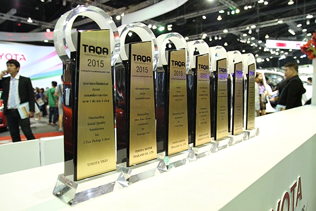 จากความพยายามทุ่มเทในการผลิตรถยนต์ที่มีคุณภาพ การปรับปรุงด้านการขายและการบริการหลังการขาย เพื่อให้บรรลุเป้าหมายในการสร้างความพึงพอใจสูงสุดให้กับลูกค้า บริษัท โตโยต้า มอเตอร์ ประเทศไทย จำกัด มีความภาคภูมิใจที่ได้รับการพิจารณาจากคณะกรรมการตัดสินรางวัลธุรกิจยานยนต์ยอดนิยมแห่งปี 2558 ให้ได้รับรางวัลถึง 7 รางวัล ประกอบด้วย ด้านการขาย 2 รางวัล ด้านคุณภาพแรกใช้ผลิตภัณฑ์ 3 รางวัล และด้านการบริการหลังการขาย 2 รางวัล รางวัลธุรกิจยานยนต์ยอดนิยม TAQA เริ่มดำเนินการมาตั้งแต่ปี พ.ศ. 2545 โดยความร่วมมือของหน่วยงานหลัก 4 หน่วยงาน ประกอบด้วย สถาบันยานยนต์ บริษัท คัสต้อมเอเซีย จำกัด หนังสือพิมพ์ผู้จัดการ และบริษัท สื่อสากล จำกัด รางวัลนี้สะท้อนความสำเร็จในการผลิตและการให้บริการที่มุ่งลูกค้าและการตลาดเป็นสำคัญ เนื่องจากเป็นผลจากการสำรวจความพึงพอใจของผู้บริโภคโดยตรงต่อผลิตภัณฑ์ การขาย และการบริการหลังการขาย เพื่อยกระดับคุณภาพของสินค้าและบริการในธุรกิจยานยนต์ และพัฒนาอุตสาหกรรมยานยนต์ของประเทศ