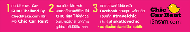 Chic Car Rent ใจดี จัดกิจกรรม บอกรักสุด CHIC ลุ้น "บินฟรี ขับฟรี พักฟรี กับทริปภูเก็ตทะเลหวานเว่อร์" เชิญทุกคนมาร่วมสนุกด้วยการครีเอทวิธีบอกรักสุด CHIC ลุ้นของรางวัลสุดชิค จำนวน 1 รางวัล รวมมูลค่ากว่า 20,000 บาท โดยมีรายละเอียด ดังนี้