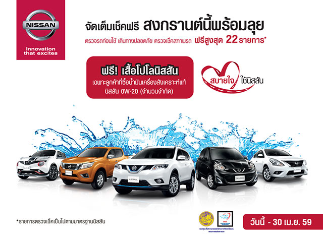 บริษัท นิสสัน มอเตอร์ (ประเทศไทย) จำกัด จัดแคมเปญ "จัดเต็มเช็คฟรี สงกรานต์นี้พร้อมลุย" เชิญชวนเจ้าของรถยนต์ นิสสันทุกรุ่น เข้ารับบริการตรวจเช็คสภาพรถฟรีสูงสุด 22 รายการ ตั้งแต่วันที่ 1- 30 เมษายน 2559 ที่โชว์รูมนิสสันทั่วประเทศพิเศษสำหรับลูกค้าที่ซื้อน้ำมันเครื่องสังเคราะห์แท้นิสสันเฉพาะเกรด 0W-20 ทุกๆ 1 แกลลอน รับฟรีเสื้อโปโลนิสสัน 1 ตัว