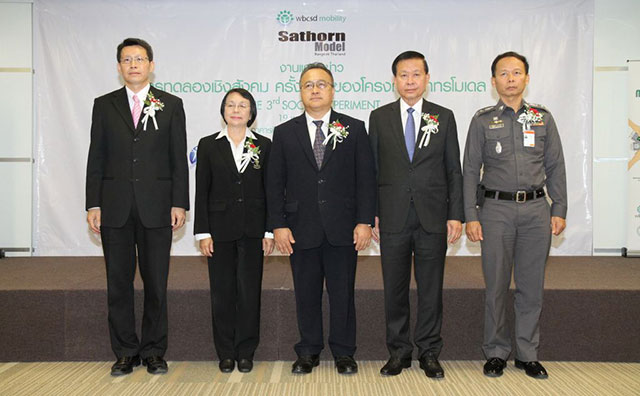 นายดรุณ แสงฉาย รองปลัดกระทรวงคมนาคม พร้อมด้วยนางอัจฉรา ห่อสมบัติ รองผู้อำนวยการสำนักการจราจรและขนส่ง กรุงเทพมหานคร พันตำรวจเอก สุปัฎน์ จรจันทึก ผู้กำกับกองกำกับการ 1 กองบังคับการตำรวจจราจร รศ.ดร. สุพจน์ เตชวรสินสกุล ผู้แทนจากคณะวิศวกรรมศาสตร์ จุฬาลงกรณ์มหาวิทยาลัย และนายนินนาท ไชยธีรภิญโญ ประธานร่วมคณะกรรมการโครงการคมนาคมอย่างยั่งยืน 2.0 กรุงเทพมหานคร ร่วมเป็นประธานแถลงข่าว การทดลองเชิงสังคม ครั้งที่ 3 ของโครงการสาทรโมเดล