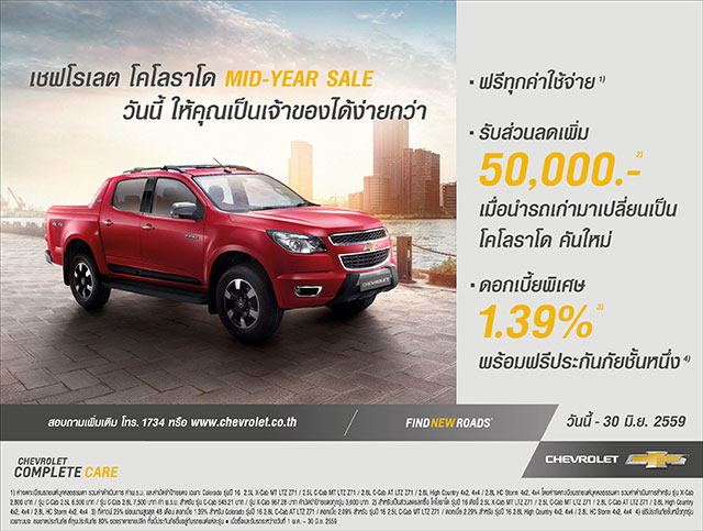 แคมเปญสุดพิเศษนี้ ทำให้ลูกค้าสามารถเป็นเจ้าของโคโลราโดและเพลินเพลินกับรถเชฟโรเลตได้ง่ายขึ้น ด้วยข้อเสนอรถเก่า (ทุกรุ่นทุกยี่ห้อ) แลกซื้อโคโลราโดใหม่ รับส่วนลดจากราคาประเมินรถคันเก่าสูงสุด 50,000 บาท ดอกเบี้ยต่ำสุด 0% นาน 48 เดือน พร้อมด้วยฟรีประกันภัยชั้นหนึ่ง นอกจากนี้ยังฟรีทุกค่าใช้จ่าย (สำหรับรถบางรุ่น) ข้อเสนอนี้สำหรับลูกค้าที่ซื้อหรือจองและรับรถเชฟโรเลตทุกรุ่นระหว่างวันที่ 1 พฤษภาคม - 30 มิถุนายน 2559 เท่านั้น