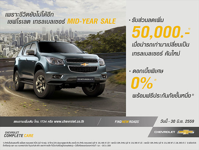 เชฟโรเลต แคปติวา รุ่นปี 2016 - ฟรีประกันภัยชั้นหนึ่งสำหรับทุกรุ่น เชฟโรเลต เทรลเบลเซอร์ รุ่นปี 2016 - รับข้อเสนอแคมเปญรถเก่าแลกซื้อรถใหม่รับส่วนลดจากราคาประเมินรถคันเก่า 50,000 บาทสำหรับทุกรุ่น อีกทั้งเทรลเบลเซอร์ รุ่นปี 2016 2.8 ลิตร เกียร์อัตโนมัติ ขับเคลื่อนสี่ล้อ LTZ1 มาพร้อมข้อเสนอดอกเบี้ย 0% ผ่อนนาน 48 เดือนที่ดาวน์ 25% ขณะที่รุ่น 2.8 ลิตร ขับเคลื่อนสองล้อ เกียร์อัตโนมัติ LTZ มาพร้อมดอกเบี้ย 0.59% ผ่อนนาน 48 เดือนที่ดาวน์ 25% ส่วนเทรลเบลเซอร์ 2.5 ลิตร ขับเคลื่อนสองล้อ เกียร์ธรรมดา LT และ 2.8 ลิตร ขับเคลื่อนสองล้อ เกียร์อัตโนมัติ LT มาพร้อมข้อเสนอดอกเบี้ย 1.59% ผ่อนนาน 48 เดือนที่ดาวน์ 25% เทรลเบลเซอร์ทุกรุ่นจะได้รับข้อเสนอฟรีประกันภัยชั้นหนึ่ง
