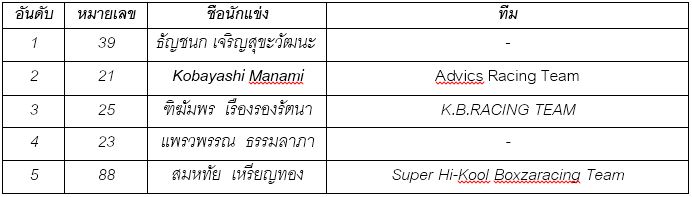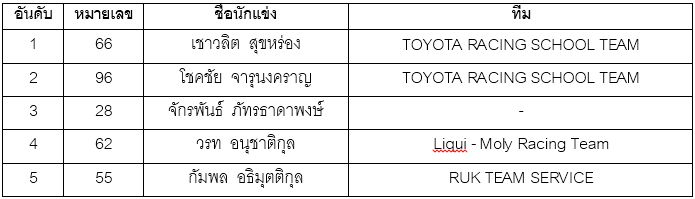 ผลการแข่งขัน "เชาวลิต สุขหร่อง จาก "โตโยต้า เรซซิ่งสคูล" โชว์ฟอร์มเยี่ยม คว้าแชมป์ "วีออส วันเมคเรซ" ขณะที่ "ธัญชนก เจริญสุขวัฒนะ" ยังคงรักษาแชมป์ประจำสนามนี้ได้ในรุ่น "วีออส วันเมคเรซ เลดี้คัพ" รวมถึง "Naoki Kawamura" นักแข่งจากประเทศญี่ปุ่นคว้าแชมป์ "โคโรลล่า อัลติส วันเมคเรซ" และ "ธนวัฒน์ สุวรรณรัตน์" คว้าแชมป์เป็นคนแรกในรายการ "ไฮลักซ์ รีโว่ วันเมคเรซ" ไปครอบครอง