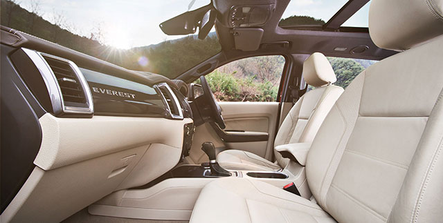 ห้องโดยสารของฟอร์ด เอเวอเรสต์ ขนาด 7 ที่นั่ง หรูหรา ประณีต นั่งสบาย และใช้งานสะดวกด้วยคุณสมบัติมากมาย ทั้งหลังคาแบบพาโนรามิคมูนรูฟขนาดใหญ่เปิดกว้างได้ถึงแถวที่นั่งด้านหลัง ช่องเก็บของเพื่อวางแก้วน้ำและอื่นๆ กว่า 30 ช่อง ปลั๊กต่ออุปกรณ์ไฟฟ้าสำหรับผู้โดยสารด้านหน้าและด้านหลัง และปลั๊กไฟบ้านเพื่อเพิ่มความสะดวกในการใช้งานมากขึ้น เบาะนั่งสามารถปรับเปลี่ยนให้เข้ากับทุกการใช้งานได้โดยเบาะนั่งแถวที่สองและสาม สามารถแยกพับและพับเก็บให้แบนราบได้ทั้งสองแถว เพื่อการบรรทุกสัมภาระขนาดใหญ่ได้ถึง 2,010 ลิตร รวมทั้งเพิ่มความสะดวกในการพับเบาะด้วยระบบไฟฟ้าสำหรับเบาะแถวที่สาม รวมถึงประตูท้ายรถเปิด-ปิดด้วยไฟฟ้าพร้อมระบบป้องกันประตูหนีบ