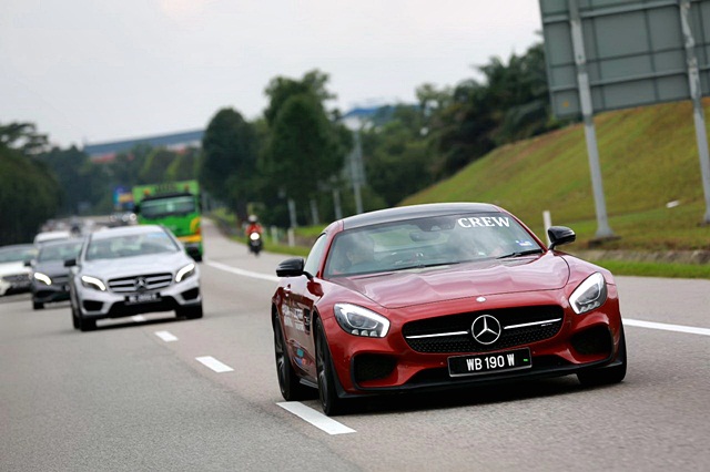 ขบวนรถเมอร์เซเดส-เบนซ์ กลุ่มคอมแพกต์กว่า 80 คัน เริ่มต้นตั้งแถวออกจากโรงแรม เดอะ ริชต์ คาร์ลตัน สิงคโปร์ ในช่วงสายของวันจันทร์ที่ 12 ผู้เขียนได้ขับรถรุ่น Mercedes-AMG GLA 45 4MATIC ที่มีพลังเกือบ 400 แรงม้า จากเครื่องยนต์เบนซิน 2.0 ลิตร เทอร์โบ โดยมีจุดหมายปลายทางอยู่ที่ TREC โชว์รูมเมอร์เซเดสฯ ในกัวลาลัมเปอร์ การขับในช่วงแรกขบวนฯ ใช้ถนนสาย PIE และ BKE เพื่อข้ามไปประเทศมาเลเซียที่ Woodlands Crossing รถ GLA45 ของผู้เขียนขับมาถึงหน้าด่านตอน 11.00 น. ระยะทางวัดจากโรงแรมได้ 29 กม. การผ่านด่านวู้ดแลนด์ต้องขับเข้าตามช่องตรวจแบบไดร์ฟทรู โดยยื่นพาสปอร์ตและ เสียค่าผ่านทางจากในรถ จากนั้นขับข้ามสะพานไปฝั่งมาเลเซีย แล้วเจอด่านช่องไดร์ฟทรูของ ตม. มาเลเซีย ก็ยื่นพาสปอร์ตแสดงตัวอีกครั้ง พร้อมเสียค่าผ่านทาง แล้วเดินทางต่อ