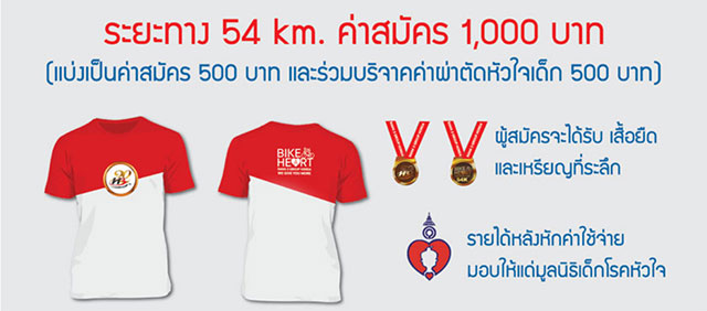 ค่าสมัครเข้าร่วมกิจกรรม 1,000 บาท โดยผู้สมัครจะได้รับเสื้อยืดและเหรียญที่ระลึก และรายได้ส่วนหนึ่งหลังหักค่าใช้จ่าย จะบริจาคให้แก่มูลนิธิเด็กโรคหัวใจ จำนวนเงิน 500 บาท / 1 ใบสมัคร