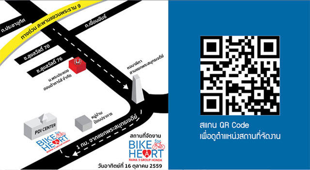พระราม 3 กรุ๊ป ฮอนด้า ขอเชิญร่วมปั่นจักรยานการกุศล "ให้หัวใจ ให้ชีวิต" เริ่มเส้นทางจาก PDI Center พระราม 3 กรุ๊ป ฮอนด้า - วัดหลวงพ่อเต่า ในวันอาทิตย์ที่ 16 ต.ค. 2559 เส้นทางปั่นจักรยานเป็นระยะทาง 54 กม.