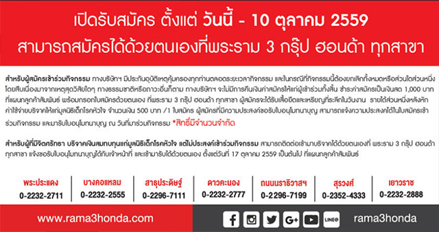 เปิดรับสมัครแล้ววันนี้ - 10 ต.ค. 59 สามารถสมัครได้ด้วยตนเองที่ พระราม 3 กรุ๊ป ฮอนด้า ทุกสาขา คลิกเข้าร่วมกิจกรรมและดูรายละเอียดได้ที่ - http://www.rama3honda.com/WeGiveYouMore/BikeForHeartApp.php